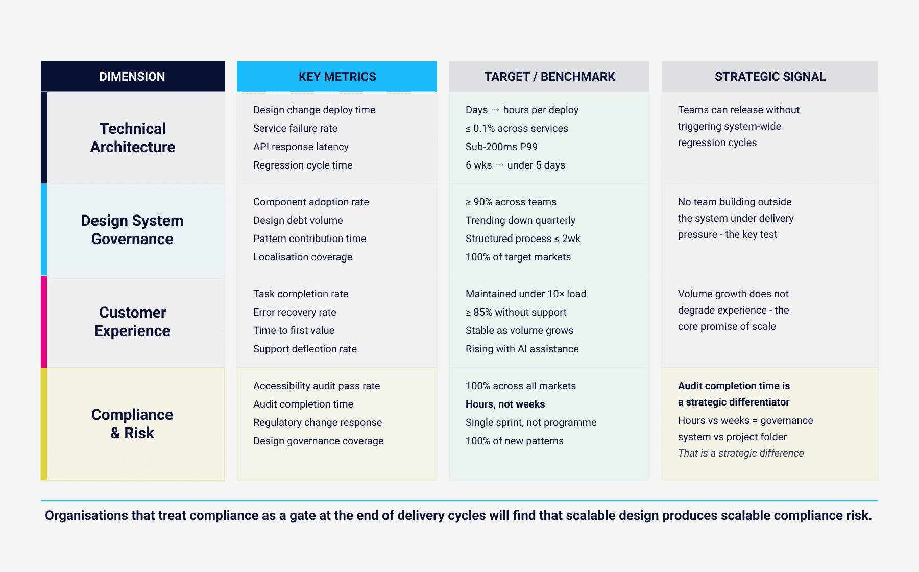 The compliance and risk row deserves specific attention in the banking context. Risk governance is not a separate track from scalable design it is embedded in it. Every architectural decision, every design pattern, every automation layer carries regulatory implications. Organisations that treat compliance as a gate at the end of delivery cycles will find that scalable design produces scalable compliance risk.