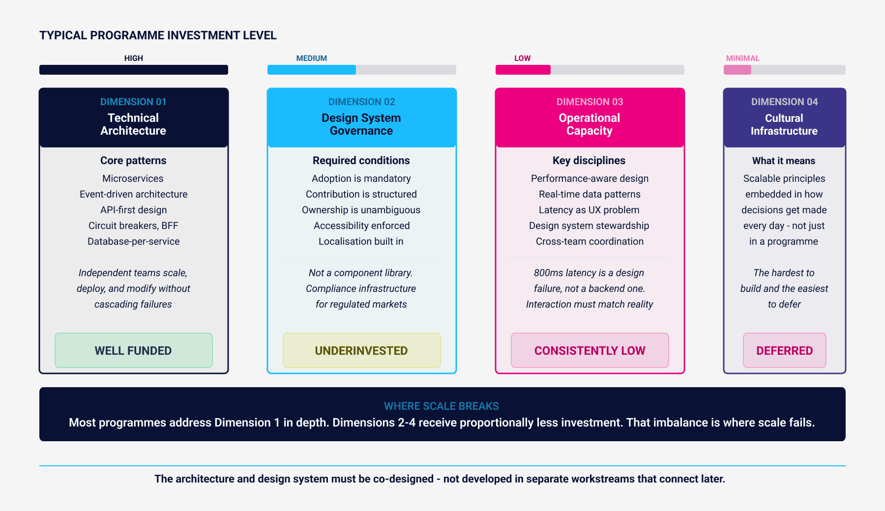 The second dimension is where most banks underinvest. They treat design as downstream of engineering, which means design debt accumulates quietly and surfaces only when the organisation tries to move fast on something new.